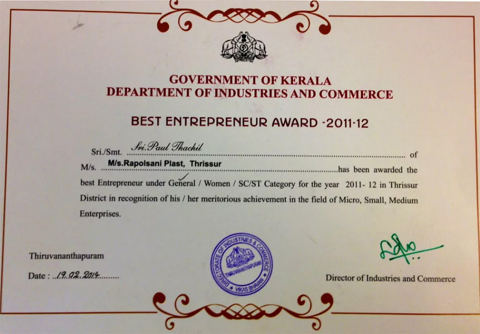 Managing Director receiving the District level Best Entrepreneurs Award for 2012 from Directorate of Industries and Commerce, Kerala Government